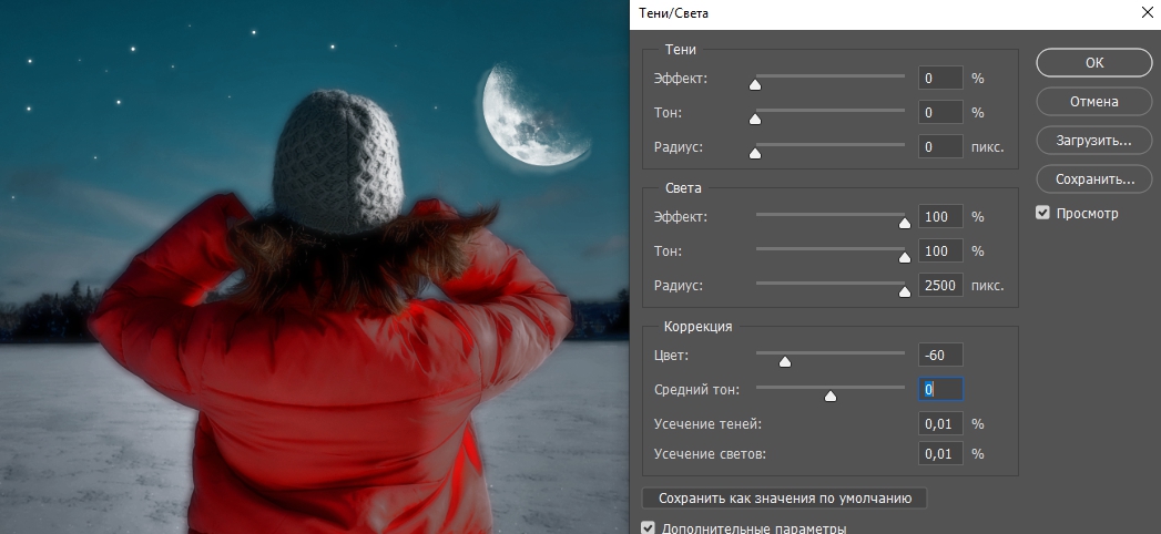 Создаем дубликат слоя (Ctrl+J) и идем в меню Изображение – Коррекция – Света/Тени Image (Adjustments – Shadow/Highlights) и устанавливаем следующие параметры: