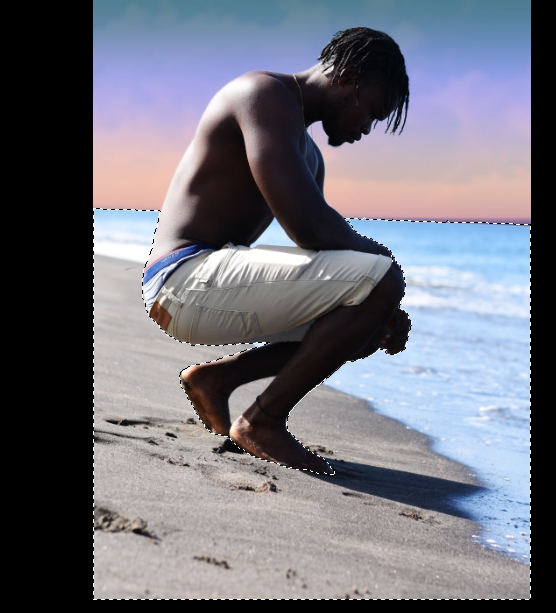 Последнее, что осталось сделать – это изменить оттенок самого мужчины. Нужно перенести его на новый слой. Есть простой способ. Зажмите Ctrl и щелкните мышкой по слою с небом. У вас появится выделение. Затем зажмите Ctrl+Shift и щелкните по слою с сушей и водой. К предыдущему выделению добавится новое. После чего инвертируйте выделение Выделение – Инверсия (Select – Inverse) (Shift+Ctrl+I). Затем перейдите фоновый слой и нажмите Ctrl+J, чтобы дублировать выделенную область на новый слой.