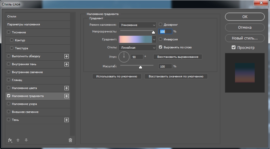 Примените к полученному слою стиль Наложение градиента (Gradient Overlay).