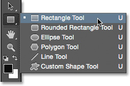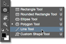 Программа Photoshop предлагает нам на выбор шесть инструментов группы «Фигуры»: «Прямоугольник» (Rectangle Tool), «Прямоугольник с закругленными краями» (Rounded Rectangle Tool), «Эллипс» (Ellipse Tool), «Многоугольник» (Polygon Tool), «Линия» (Line Tool) и «Произвольная фигура» (Custom Shape Tool). Все эти инструменты расположены в одном месте на панели инструментов. По умолчанию, нам виден инструмент «Прямоугольник», но если мы кликнем по иконке инструмента и удержим нажатой кнопку мыши, то на экране появится выпадающее меню с перечнем других инструментов, из которых мы сможем выбрать нужный: