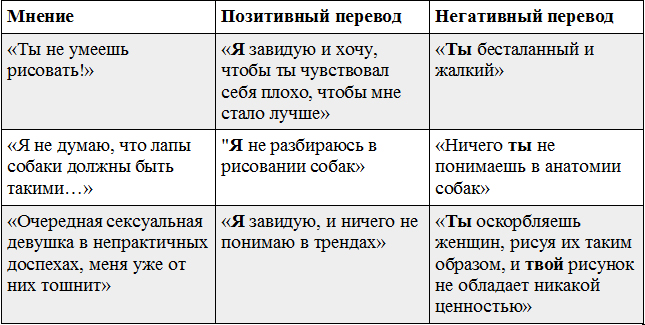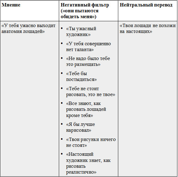 Когда вы используете негативный фильтр, вы можете подумать то, что комментатор не имел ввиду. «Возьми да сам нарисуй получше, раз ты такой умный!» - это защитная реакция на воображаемое «Я бы нарисовал лучше». Но человек ведь этого не говорил!
