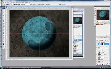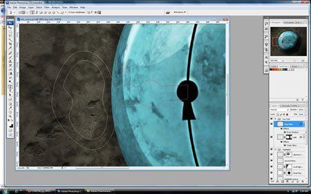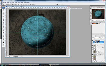 Переместим выделение на новый слой, создайте его, нажмите Ctrl+X чтобы вырезать выделение, затем Ctrl+V чтобы вставить его. Нам нужен черный цвет, так как это тень. Нажмите Ctrl+I чтобы инвертировать цвета из белого в черный. Переименуйте слой в "crater 2". К обоим слоям "Crater" и "Crater 2" применим маску-слоя, изменим Режим наложения на Soft Light (Мягкий свет). Смягчим края на обоих слоях с помощью Gradient Tool