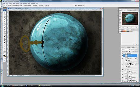 Нам нужно сделать щель в сфере для замка с ключом, который мы создадим позднее. Над группой "highlights" создайте новую, назвав ее "key hole". Создайте новый слой внутри группы и назовите его "split". С помощью инструмента Elliptical Marquee Tool (M)