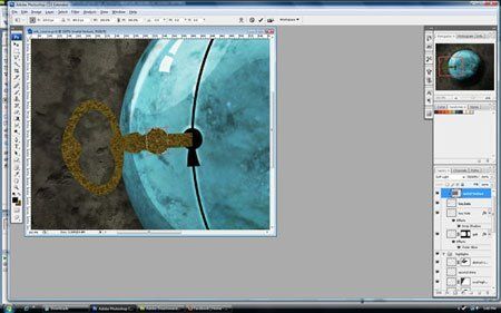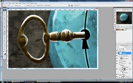 Теперь включите свободное трансформирование командой Ctrl+Т и разверните ключ. Так как источник света исходит из верхнего левого угла, то наша тень будет падать на правый нижний угол. Нам нужно будет раздавить ключ по поверхности сферы, перетащите его так, чтобы он соединялся с настоящим ключом, затем приплюсните его немного.