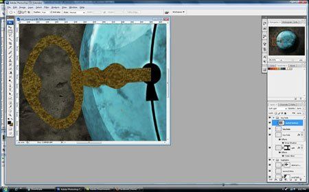 Ключ готов, но он имеет обрубленный конец. Чтобы это исправить выделите следующие слои: "highlights copy", "highlights", "darkest shadow," "metal texture" и "key base". Убедитесь что эти слои выделены одновременно, затем нажмите Ctrl+G чтобы сгруппировать их в одну папку. Назовите ее "key". Создайте маску для группы, так же как и для слоя, этим мы сможем прятать одновременно все слои в группе. Воспользуйтесь черным градиентом, скройте правую часть ключа, чтобы он плавно перетекал в щель замка.