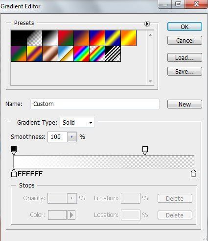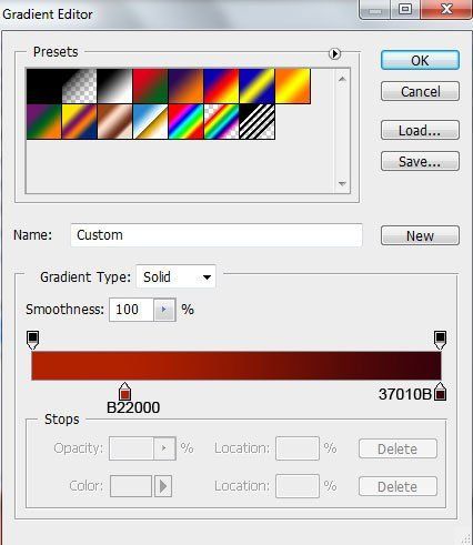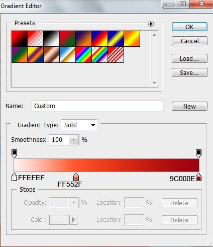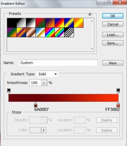Кликните по цветной полосе, чтобы открыть редактор градиента и установите настройки как показано ниже. Затем нажмите "ОК", чтобы закрыть редактор градиента.