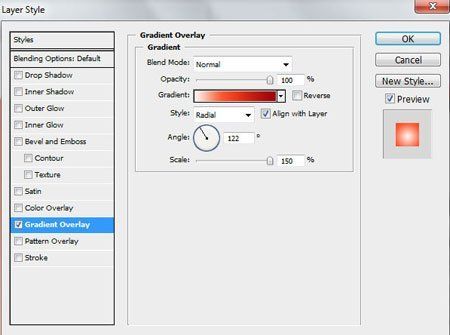 Кликните "Добавить стиль слоя" на панели слоев и выберите "Наложение градиента" со следующими настройками: