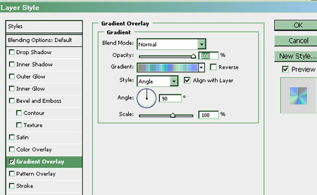 Следующим этапом работы, будет создание лучей света, проходящих через воду. Создаём новый документ 2000х2000рх. Заливаем любым цветом и добавляем эффект слоя – Градиент (Layer- Layer Style-Gradient Overlay)