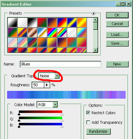 Совет переводчика: При выборе градиента из группы Noise можно несколько раз покликать на кнопку Randomize, чтобы выбрать нужный вариант.