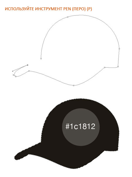 (Перо), чтобы нарисовать фигуру бейсболки (вы можете использовать в качестве ориентира изображение бейсболки или этот контур, представленный ниже). После чего нажмите Ctrl+Enter, чтобы трансформировать контур в выделение. Затем залейте его цветом #1c1812.