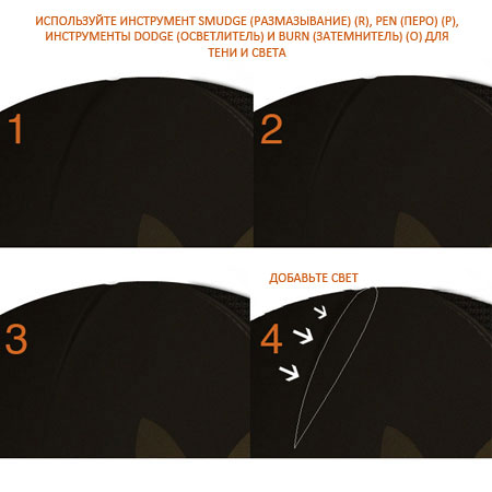 Чтобы создать углубленные линии бейсболки, используйте инструмент Pen (Перо) (P), чтобы создать форму выделения, добавьте свет и тени с помощью инструментов Burn