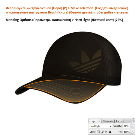 (Перо) (P). Затем вам нужно будет добавить немного света, для того, чтобы сделать заднюю часть бейсболки более прозрачной (будто свет проходит сквозь другую сторону). Используйте инструмент Brush