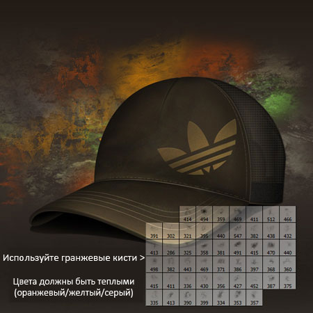 Создайте новый слой (ctrl+shift+n) и поместите его под слоями с бейсболкой. После этого используйте некоторые гранжевые кисти (например эти), создайте симпатичный фон, применяя различные цвета.
