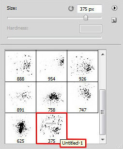 Теперь загружаем набор кистей c130_splatter и stars_and_blinks. Создаем новый слой и выбираем кисть из набора c130_splatter. Цвет кисти черный, Opacity (Непрозрачность) 60%.