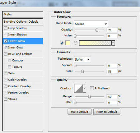 Жмем на кнопку Add a layer style (Добавить стиль слоя) внизу панели слоев и выбираем Outer Glow (Внешнее свечение).