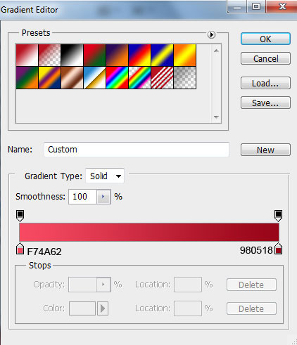 Кликните по цветной полосе, чтобы открыть Gradient Editor (Редактор градиентов) и сделайте следующие настройки. Нажмите ОК, чтобы закрыть Редактор градиентов.