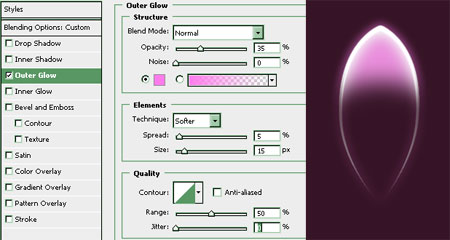 Применяем Стиль – Наружное свечение к слою Контур (тоже ставим галочку в Blending Options…):
