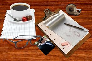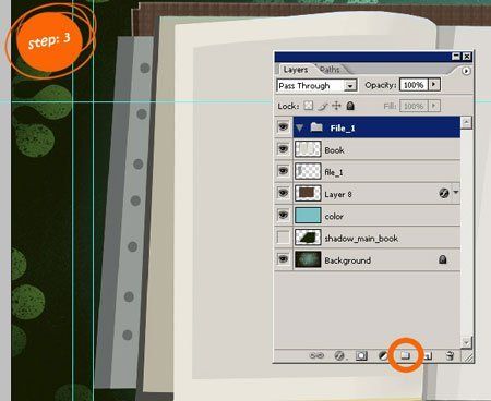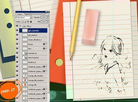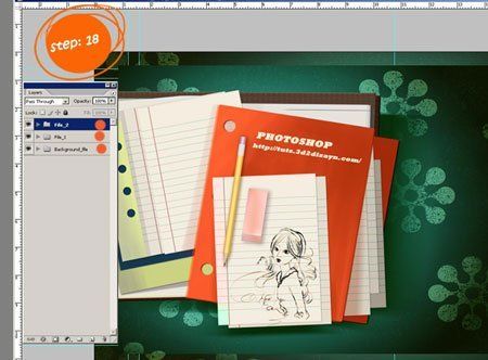 Шаг 18: Как вы видите, я закончил создание данной иллюстрации всего с тремя группами (1- фон, 2 - листы блокнота, синий и салатовый разделителем, 3 - оранжевый разделитель, листы из блокнота, карандаш, набросок). Но в каждой из них находится много слоев.