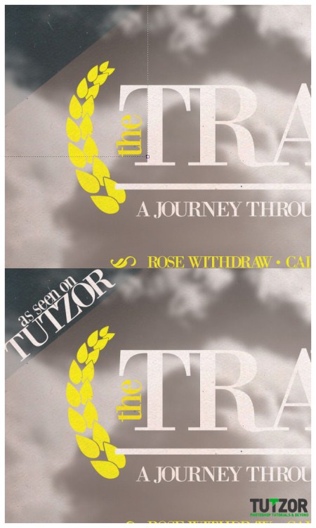 (Rectangle Tool) (U) создайте фигуру и инструментом Свободное трансформирование (Ctrl + T) поверните её. Расположите в углу, как показано ниже. Цвет фигуры – 55% серый. Тем же шрифтом, что и для названия фильма, напишите “as seen on” размером 80pt и “TUTZOR” размером 150pt.