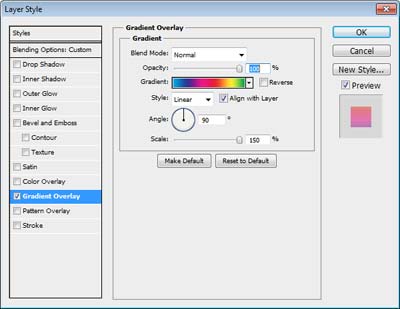 Шаг 40. Идём Слой – Стили слоя – Наложение градиента (Layer > Layer Style > Gradient Overlay). Выбираем градиент Spectrum, Угол (Angle) на 90°, и Масштаб (Scale) на 150%. Пока ещё не нажимаем OK.