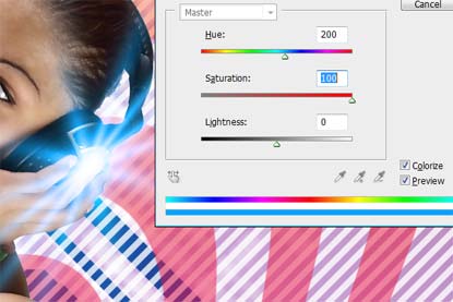 Шаг 48. Идём Изображение – Коррекция – Цветовой Тон / Насыщенность (Image > Adjustments > Hue/Saturation). Поставьте галочку в окошке Тонирование (Colorize), далее, установите значение Цветового тона (Hue) на 200 и Насыщенности (Saturation) на 100. Нажмите OK, чтобы применить настройки.