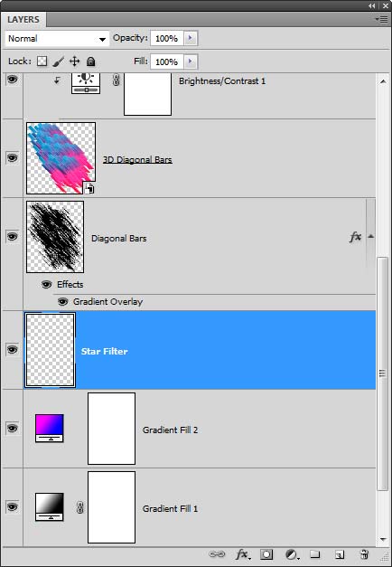 Шаг 28. Сейчас мы добавим звёздный узор при помощи стандартных фильтров, чтобы немного усилить задний фон. Создайте новый слой Слой – Новый слой (Layer > New Layer) или нажав клавиши Ctrl+Shift+N. Назовите этот слой “Звёздный фильтр” и расположите его поверх двух корректирующих слоёв градиентная заливка.
