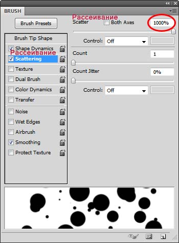 Далее, выберите опцию Рассеивание (Scattering), и установите значение Рассеивания (Scatter) на 1000%.