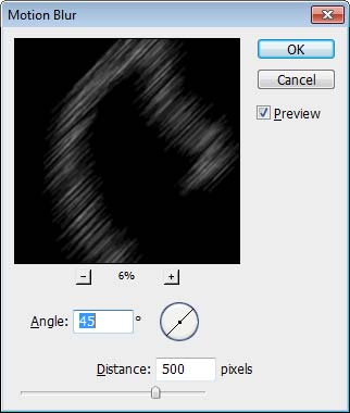 Идём Фильтр – Размытие – Размытие в движении (Filter > Blur > Motion Blur). Назначаем угол в 45°. Чтобы уменьшить масштаб области предварительного просмотра, удерживая клавишу Alt + щёлкайте мышью по области предварительного просмотра. Откорректируйте настройки, таким образом, чтобы у вас получилось размытие в движении, как на скриншоте ниже. Нажмите OK, чтобы применить настройки.