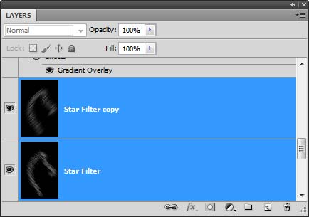 Шаг 33. Удерживая клавишу Ctrl + выберите два слоя звездные фильтры. Идём Слой – Объединить слои (Layer > Merge Layers).