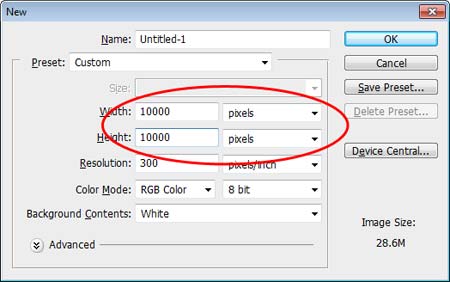 Шаг 34. Далее, мы добавим графику радиальные волны. Начнём с создания нового документа Файл – Новый (File > New) с шириной и высотой 10,000 px.