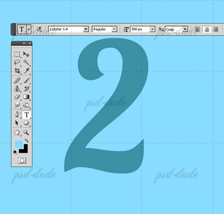 (Горизонтальный текст), выбираем загруженный ранее шрифт «Loster Font», размер устанавливаем 500 пт, цвет #3b91a4, пишем цифру «2».