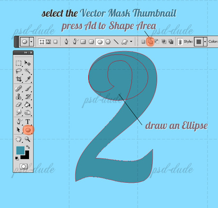 (Овальная фигура), ориентируясь на картинку, нарисуем овал на слое с цифрой «2». Чтобы всё получилось правильно, обязательно нажмите на кнопку Add to Shape Area (Добавить к области фигуры). Должно получиться вот так:
