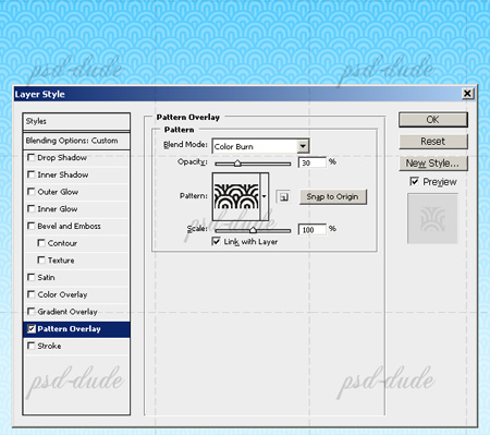 Добавляем слою с волнами Pattern Overlay (Наложение узора), узор берём из скачанного ранее набора.