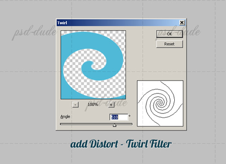 Применяем Filter – Distort - Twirl (Фильтр – Искажение - Скручивание), установите параметры, ориентируясь на скриншот. Переместите этот завиток в наш документ поверх слоя с волной.