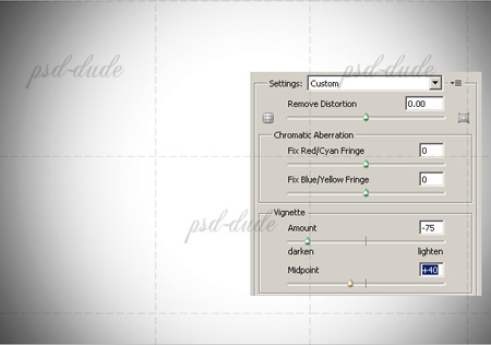 Добавляем новый слой, заливаем его белым цветом, переименовываем в Vignette (Виньетка), изменяем режим наложения на Color Burn (Затемнение основы), непрозрачность слоя ставим 80%. Применяем к этому слою Filter - Distort - Lens Correction (Фильтр – Искажение – Коррекция дисторсии) со следующими настройками:
