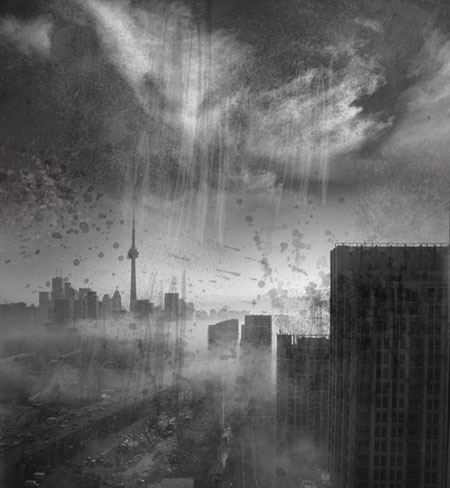 Загрузите изображение ‘Город в тумане’, переместите изображение на наш документ и расположите в нижней части документа: