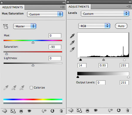 Далее, примените корректирующие слоя Цветовой тон / Насыщенность (hue/saturation) и Уровни (Level):