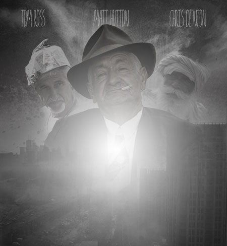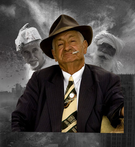 Далее, уменьшите непрозрачность слоя с гангстером до 90%, примените к слою слой-маску и на слой маске примените чёрную мягкую круглую кисть, чтобы скрыть нижнюю часть изображения и совместить изображение гангстера с основным задним фоном: