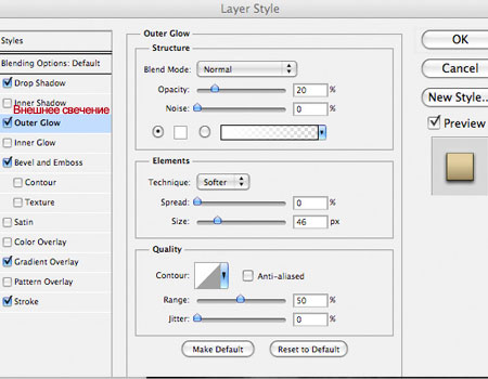 Внешнее свечение (Outer Glow):