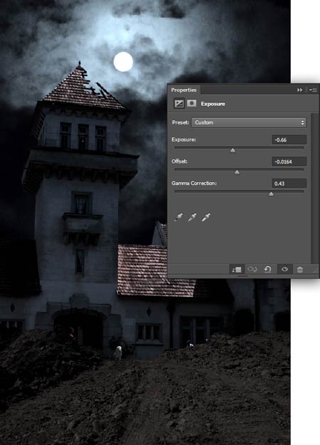 2) Далее, создайте корректирующий слой Экспозиция (Exposure) к слою с землёй, установив следующие настройки: Экспозиция (Exposure) = -0.66, Сдвиг (Offset) = -0.0164 и Гамма Коррекция (Gamma Correction) = 0.43.