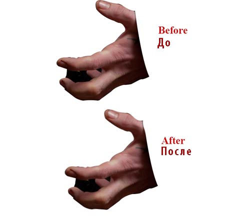 2) Выберите слой с выделением левой руки, далее, идём Фильтр- Пластика (Filter>Liquefy) и сморщите участки руки, на которые указывают стрелки с помощью инструмента Сморщивание (Pucker Tool), а затем с помощью инструмента Вздутие (Bloat Tool (B), увеличьте суставы пальцев, чтобы пальцы выглядели крючковатыми и страшными.