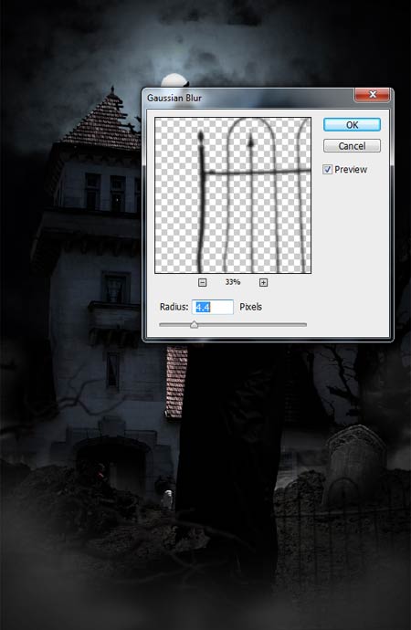 4) Далее, к слою с оградкой примените Размытие по Гауссу (Gaussian Blur), Радиус размытия (Radius) 4.4px для создания глубины резкости.