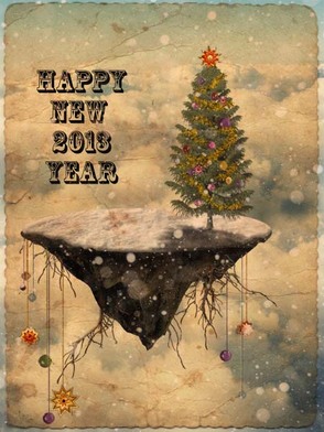 Давайте быстренько взглянем на наш коллаж фантастического летающего острова с новогодней ёлкой, который будем создавать, используя простые техники смешивания, коррекции слоёв, текстуры, кисти и, конечно же, прекрасные исходники на зимнюю тематику.