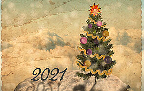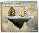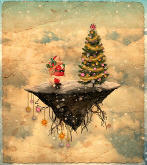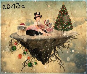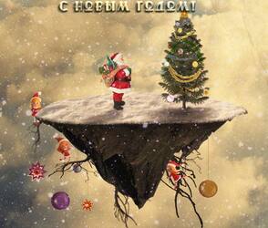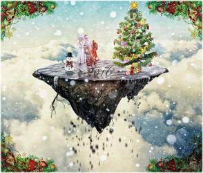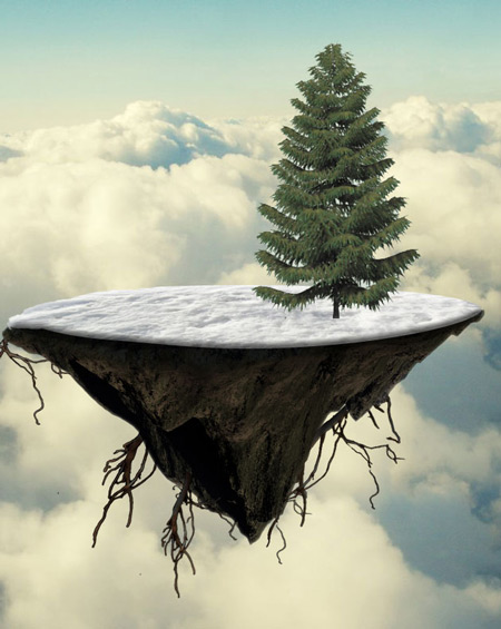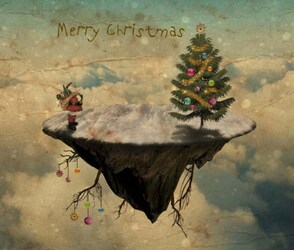 Давайте быстренько взглянем на наш коллаж фантастического летающего острова с новогодней ёлкой, который будем создавать, используя простые техники смешивания, коррекции слоёв, текстуры, кисти и, конечно же, прекрасные исходники на зимнюю тематику.