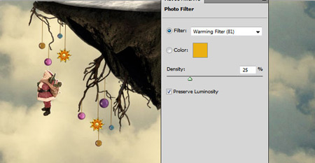 Добавьте Корректирующий слой (Adjustment Layer) Фото фильтр (Photo Filter) со следующими настройками, чтобы все элементы гармонировали друг с другом:
