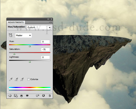 Добавим летающий скалистый остров. Как видите, у него довольно яркие оттенки ржаво-зелёного цвета, поэтому мы добавим Корректирующий слой (Adjustment Layer) Цветовой тон/Насыщенность (Hue/Saturation).