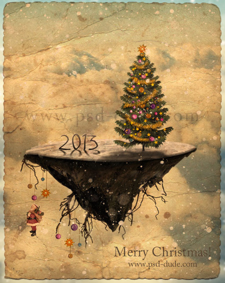 Я искренне надеюсь, что вам понравится этот новый урок, и что вы научитесь создавать креативные новогодние открытки для своей семьи и своих друзей. Как всегда мне не терпится увидеть ваши работы, надеюсь, они будут намного лучше, чем моя, и более оригинальными в исполнении. Как видите, я добавил надпись «New 2013 year» рядом с новогодней ёлкой, но вы можете её заменить своим собственным посланием, названием и т.п.