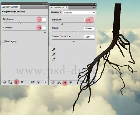 Чтобы поправить уровень яркости изображения с корнями, я добавил два Корректирующих слоя (Adjustment Layers): Экспозиция (Exposure) и Контраст (Contrast).