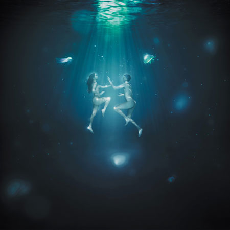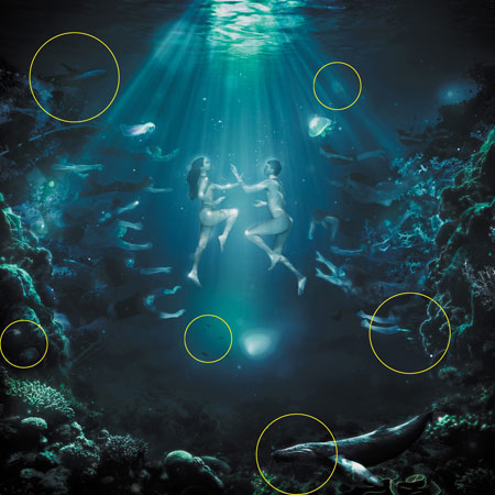 Я начал работу с фотокомпозиции, которая была основой для будущей обложки. Конечно, было бы трудно сфотографировать такое большое количество людей под водой, поэтому я решил соединить их всех в Фотошопе. Два обнажённых человека в центре – самая важная часть нашей иллюстрации, поэтому я уделил очень много времени их правильной позе.