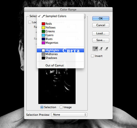 Далее, идём Выделение – Цветовой диапазон (Select > Color Range) и в выпадающем меню, выберите выделение Света (Highlights). Нажмите клавиши (Ctrl+C), чтобы скопировать активное выделение, затем, вклейте (Ctrl+V) скопированное выделение на наш рабочий документ.